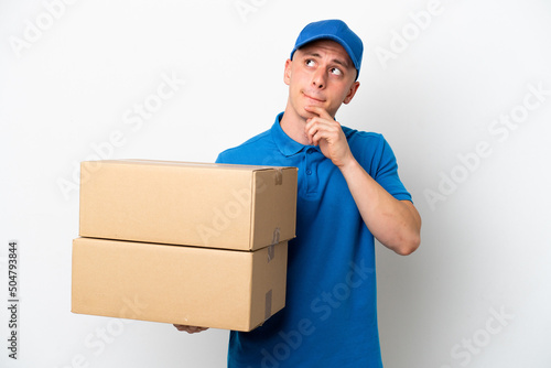 Young delivery Brazilian man isolated ops white background having doubts and thinking