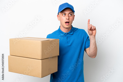 Young delivery Brazilian man isolated ops white background thinking an idea pointing the finger up