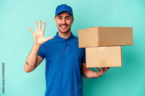 Young delivery caucasian man isolated on blue background smiling cheerful showing number five with fingers.