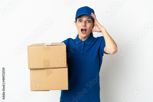 Young delivery woman isolated on white background doing surprise gesture while looking to the side