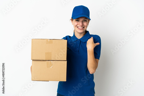 Young delivery woman isolated on white background inviting to come with hand. Happy that you came