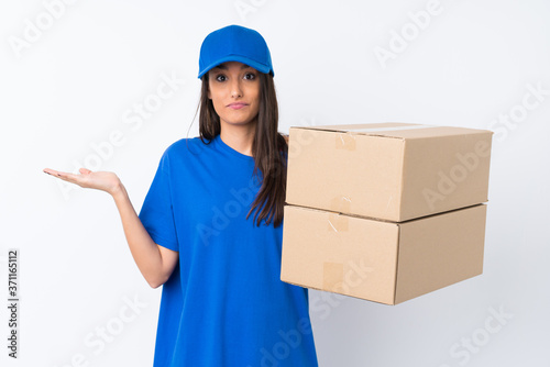 Young delivery woman over isolated white background having doubts with confuse face expression