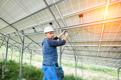 Young electrician connecting electrical cables inside the lit by sun solar modules. Installing and wiring of solar photo voltaic panel system. Alternative energy and profitable investment concept.