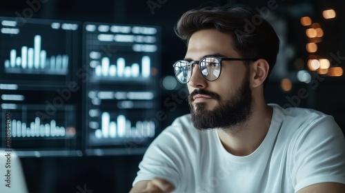 Young Entrepreneur Focused on Business Growth in a Modern Coworking Space with Data Analytics on Screens in the Background