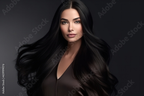 Young European woman with healthy long black hair. Shiny wavy beautiful hair.