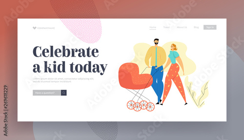Young Family Walking in the Park Landing Page. Parents with Baby Stroller. Mom and Dad with Newborn Child. Happy Mother and Father with Pram Website Banner. Vector flat illustration