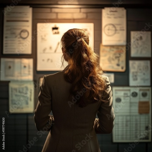 Young female detective looking at evidence board, back view. Copy space