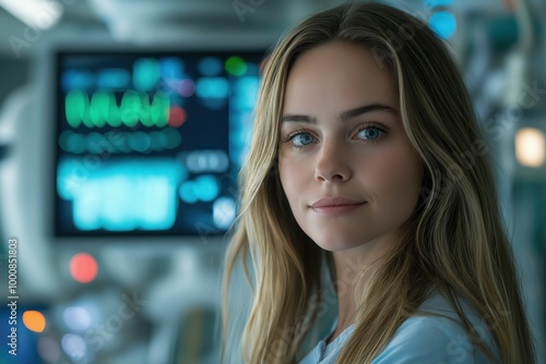 Young female scientist analyzing data on futuristic display. Advancements in medical technology and research for global health challenges