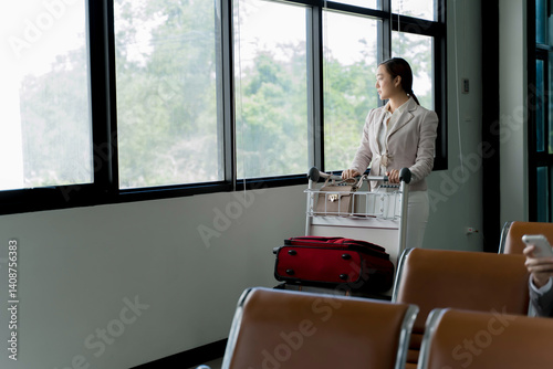 Young female traveler in business attire standing at airport with a luggage cart, looking out the window while waiting for flight departure in modern terminal