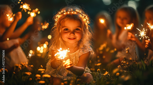Young girl is surrounded by other children, all holding lit candles. The scene is warm and inviting, with the children's faces glowing in the light of the candles. Scene is joyful and celebratory