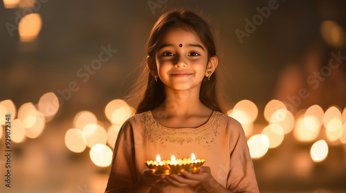 young girl, with a peaceful expression, holds diyas during a traditional Indian festival, the warmth of the flickering lights reflecting the sacred and joyful atmosphere of the cel