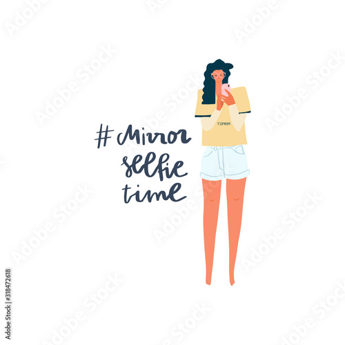 Young girl with smartphone taking selfie photo. Freehand drawing and text. Vector flat illustration