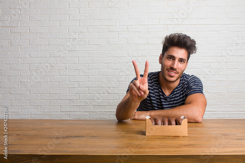Young handsome and natural man sitting on a table showing number two, symbol of counting, concept of mathematics, confident and cheerful. Eating chocolate doughnuts.