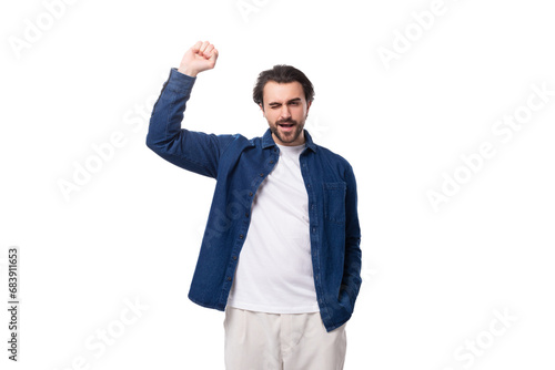 young handsome brutal brunette guy in a denim shirt joyfully raised his hand