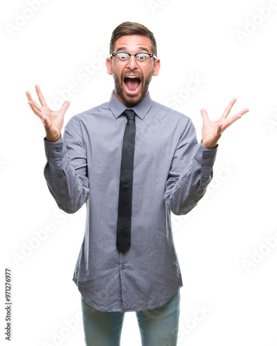 Young handsome business man over isolated background celebrating crazy and amazed for success with arms raised and open eyes screaming excited. Winner concept