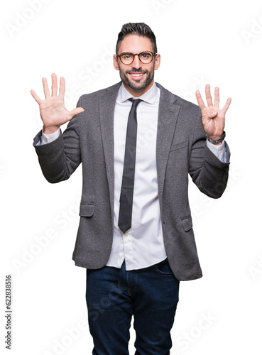 Young handsome business man over isolated background showing and pointing up with fingers number nine while smiling confident and happy.
