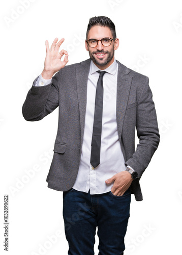 Young handsome business man over isolated background smiling positive doing ok sign with hand and fingers. Successful expression.