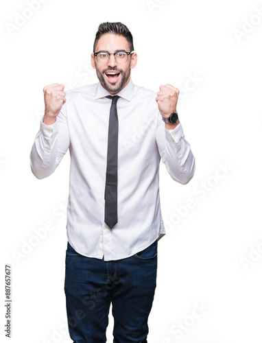 Young handsome business man wearing glasses over isolated background celebrating surprised and amazed for success with arms raised and open eyes. Winner concept.
