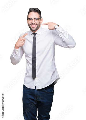 Young handsome business man wearing glasses over isolated background smiling confident showing and pointing with fingers teeth and mouth. Health concept.