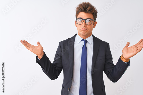 Young handsome businessman wearing suit and glasses over isolated white background clueless and confused expression with arms and hands raised. Doubt concept.