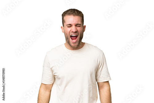 Young handsome caucasian man isolated on green chroma background shouting to the front with mouth wide open