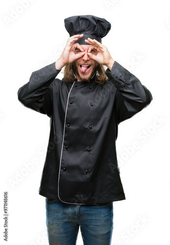 Young handsome cook man with long hair over isolated background doing ok gesture like binoculars sticking tongue out, eyes looking through fingers. Crazy expression.