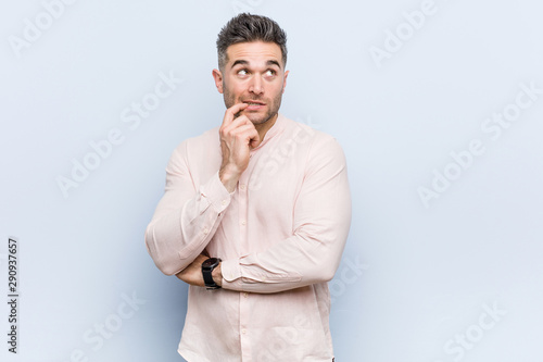 Young handsome cool man relaxed thinking about something looking at a copy space.