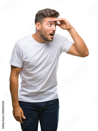 Young handsome man over isolated background very happy and smiling looking far away with hand over head. Searching concept.