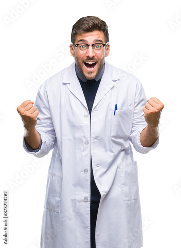 Young handsome man wearing doctor, scientis coat over isolated background celebrating surprised and amazed for success with arms raised and open eyes. Winner concept.