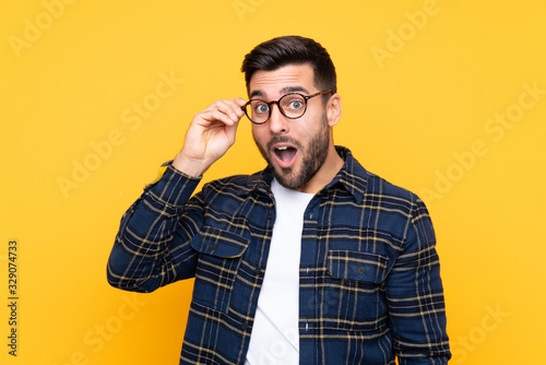 Young handsome man with beard over isolated yellow background with glasses and surprised