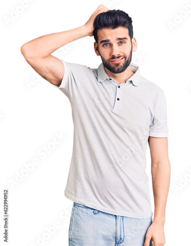 Young handsome man with beard wearing casual polo confuse and wonder about question. uncertain with doubt, thinking with hand on head. pensive concept.