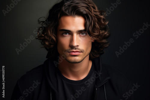 Young handsome man with long hair on dark studio background. Face of male model wearing black casual clothes. Concept of style, fashion, beauty, guy portrait, stylish hairstyle