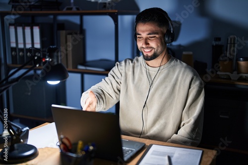 Young handsome man working using computer laptop at night smiling friendly offering handshake as greeting and welcoming. successful business.
