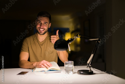 Young handsome student man studying at night at home happy with big smile doing ok sign, thumb up with fingers, excellent sign
