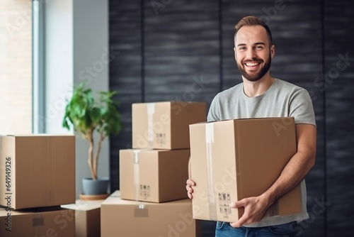 Young happy man, in his new house after moving. Unpacking boxes after moving into a new apartment. New homeowners. Mortgage. Rental of property.