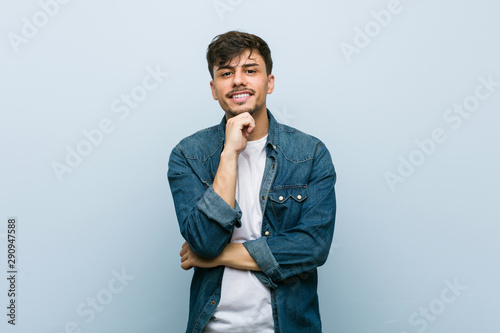 Young hispanic cool man smiling happy and confident, touching chin with hand.