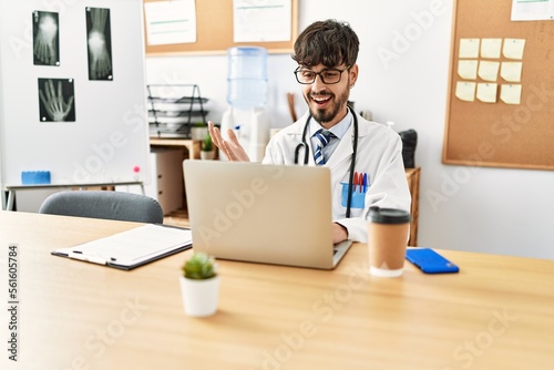 Young hispanic doctor man having video call using laptop at clinic
