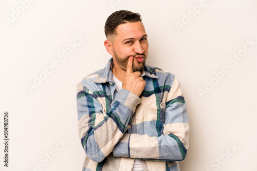 Young hispanic man isolated on white background unhappy looking in camera with sarcastic expression.