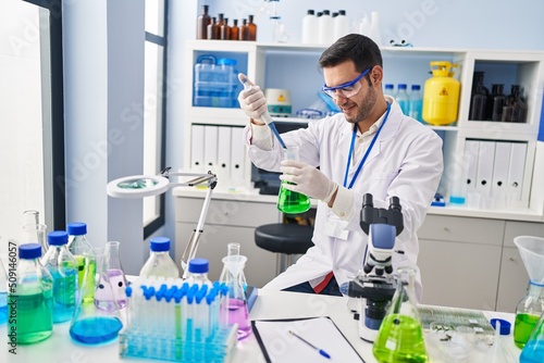 Young hispanic man scientist measuring liquid using pipette at laboratory