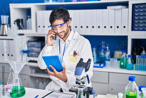 Young hispanic man scientist talking on the smartphone using touchpad at laboratory