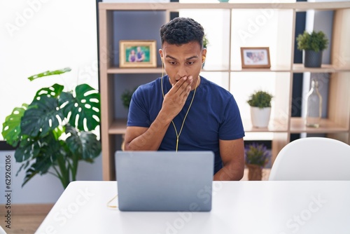 Young hispanic man using laptop at home covering mouth with hand, shocked and afraid for mistake. surprised expression