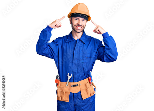 Young hispanic man wearing worker uniform smiling pointing to head with both hands finger, great idea or thought, good memory