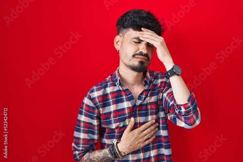 Young hispanic man with beard standing over red background touching forehead for illness and fever, flu and cold, virus sick