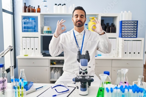 Young hispanic man with beard working at scientist laboratory relax and smiling with eyes closed doing meditation gesture with fingers. yoga concept.