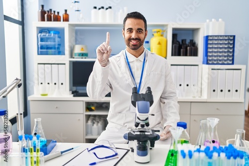 Young hispanic man with beard working at scientist laboratory showing and pointing up with finger number one while smiling confident and happy.