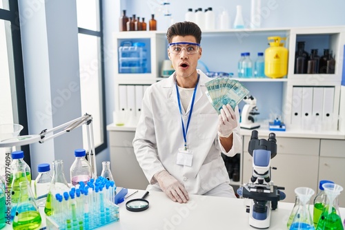 Young hispanic man working at scientist laboratory holding brazilian reals scared and amazed with open mouth for surprise, disbelief face