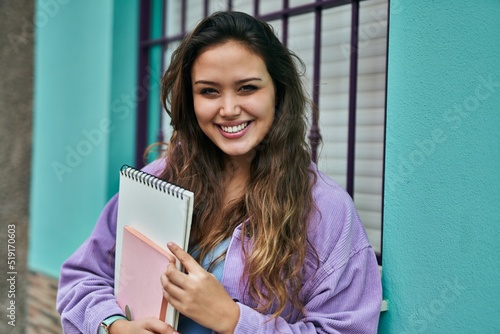 Young hispanic student woman smiling happy holding books at the city.