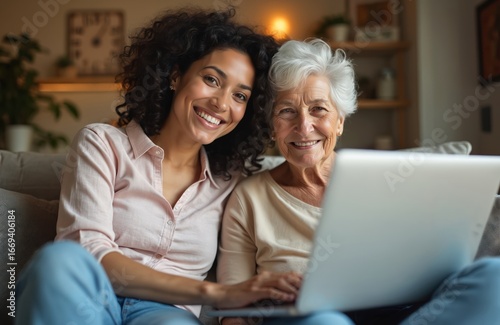 Young Hispanic woman, older Caucasian mother share heartwarming moment on couch, smiling using laptop together at home. Engaged in communication, enjoying quality time, showing affection, close