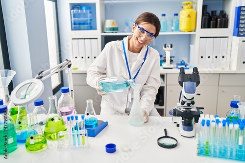 Young hispanic woman wearing scientist uniform measuring liquid at laboratory