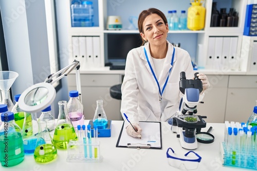 Young hispanic woman wearing scientist uniform using microscope and writing on clipboard at laboratory